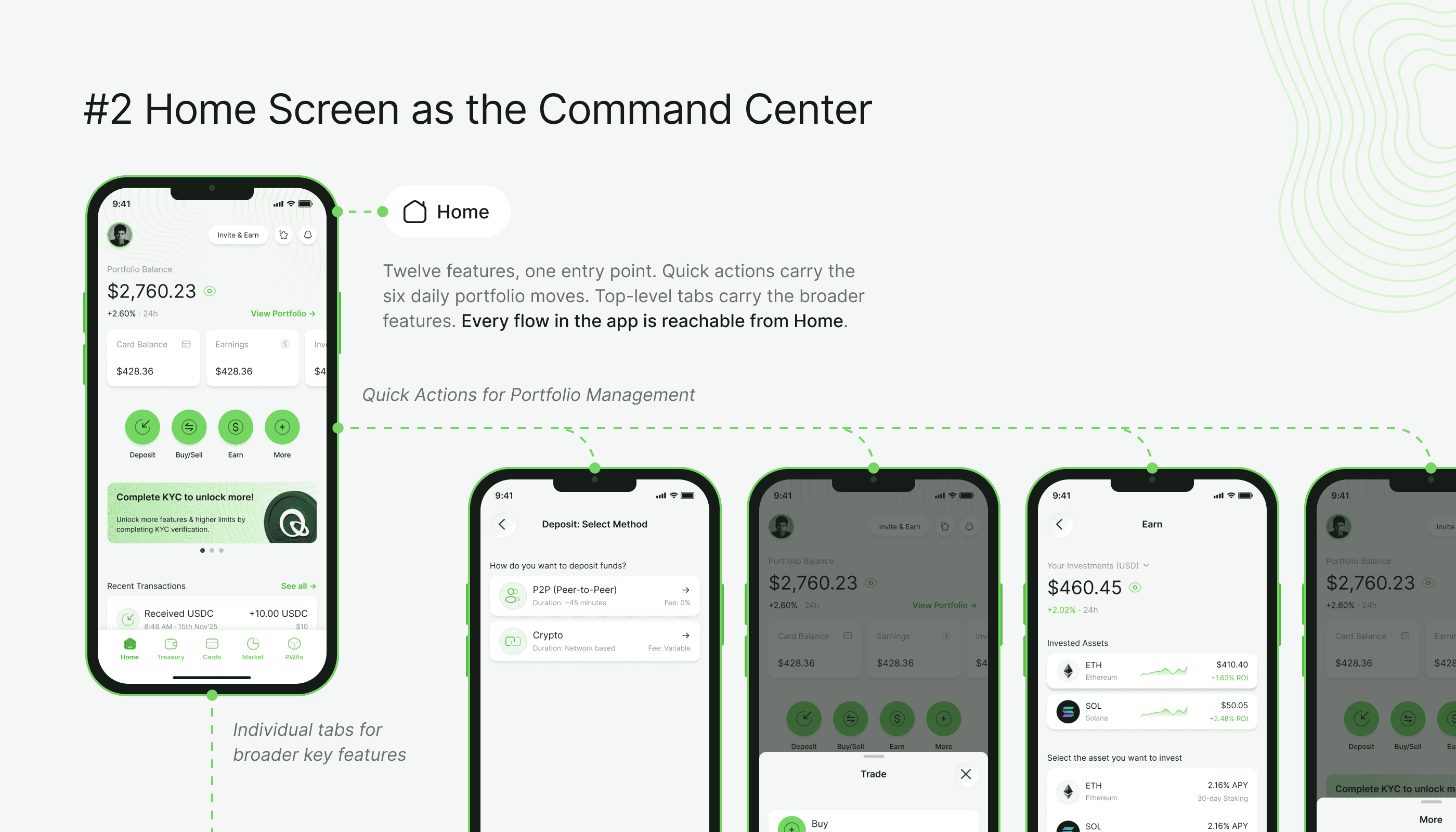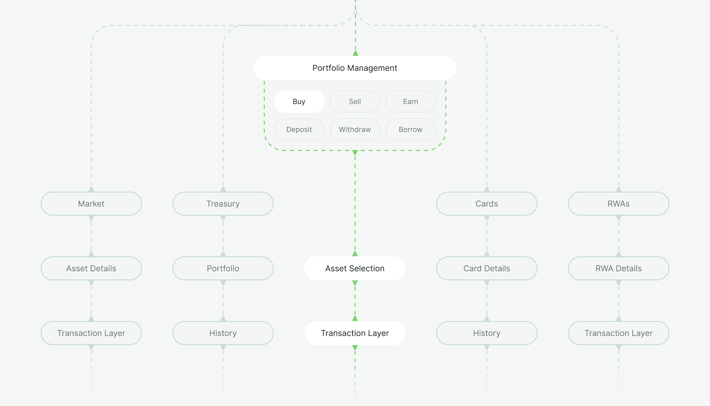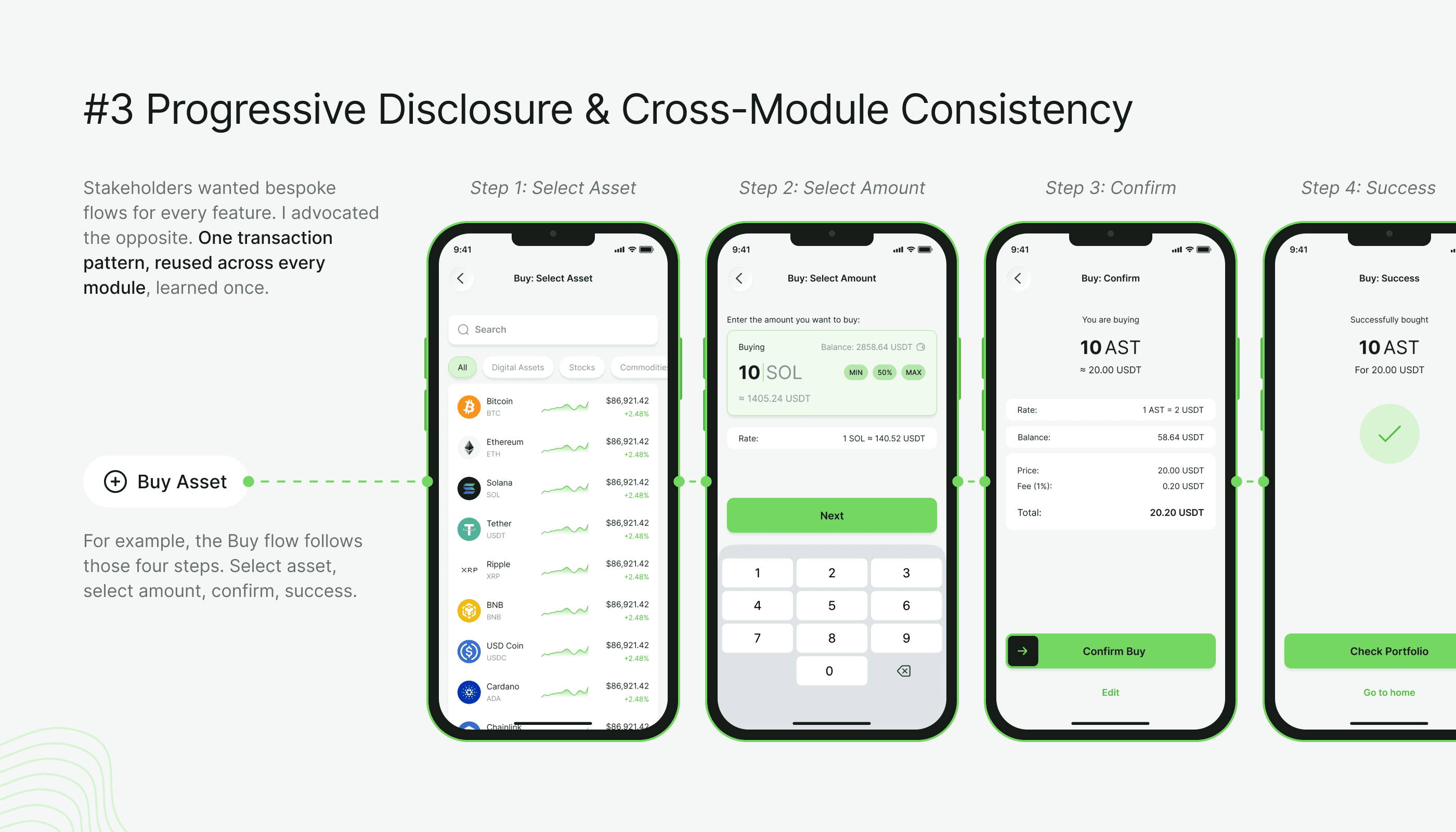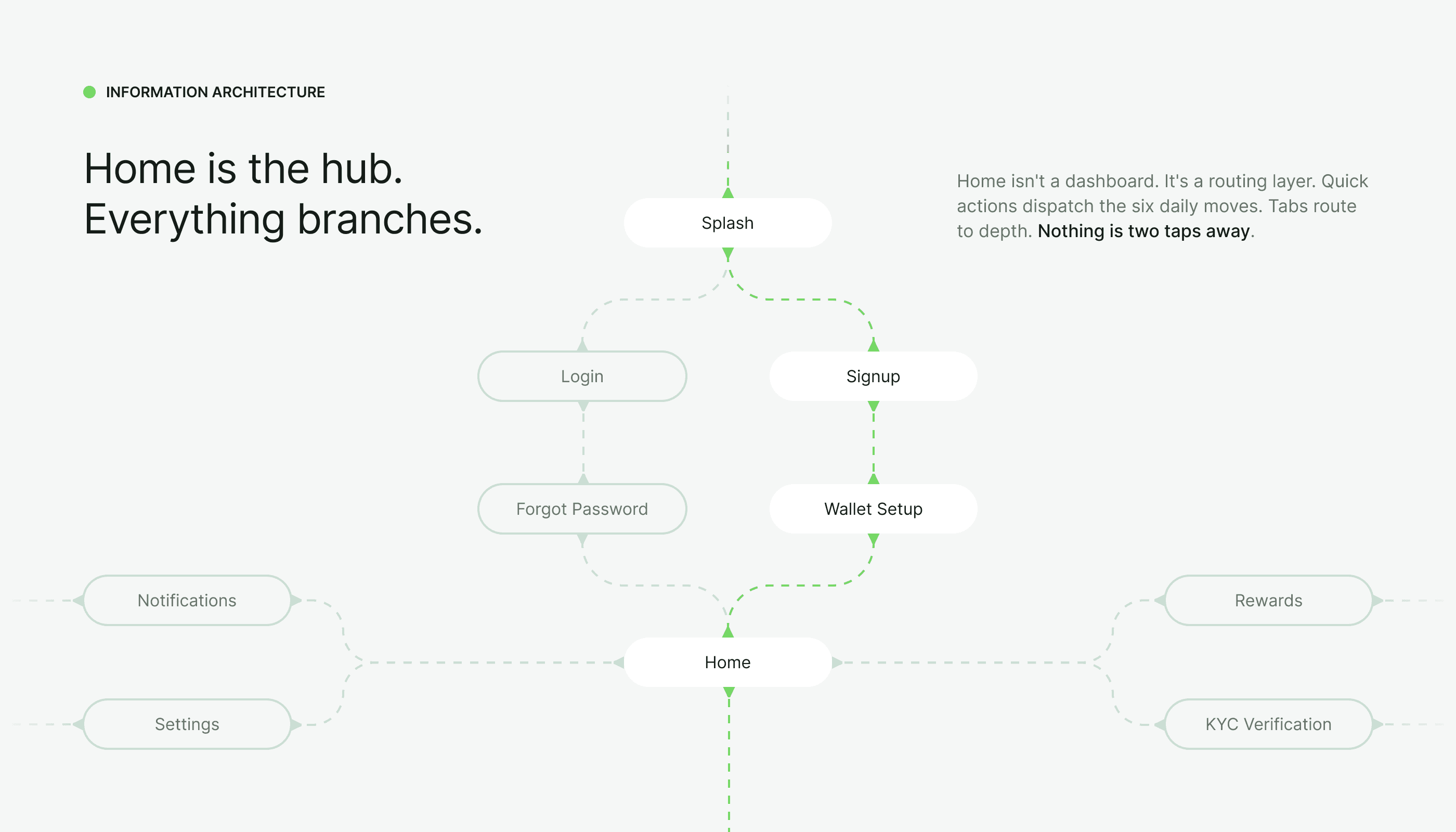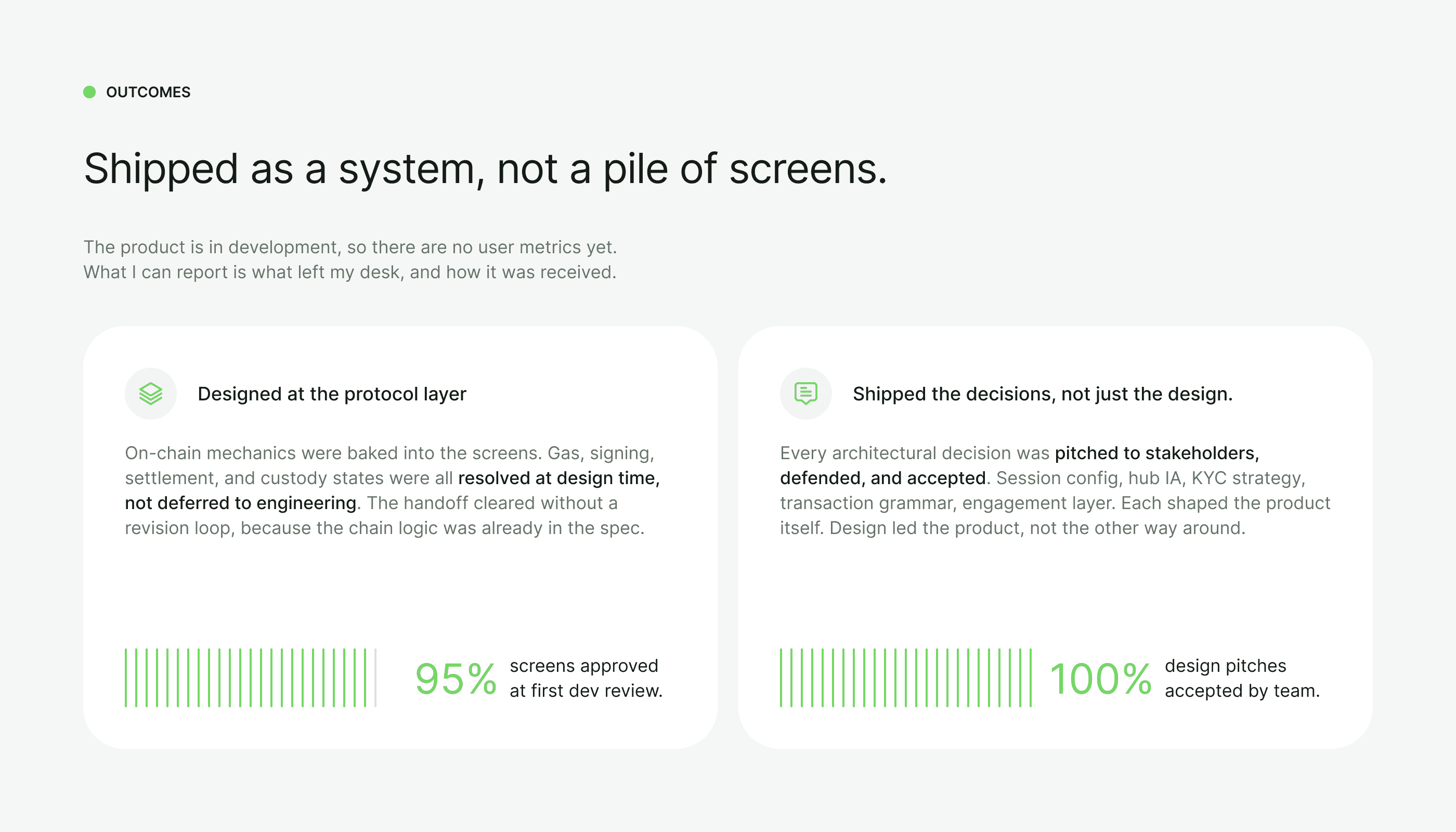 Designed at the protocol layer: 95% screens approved at first dev review. Chain logic was baked in the spec.