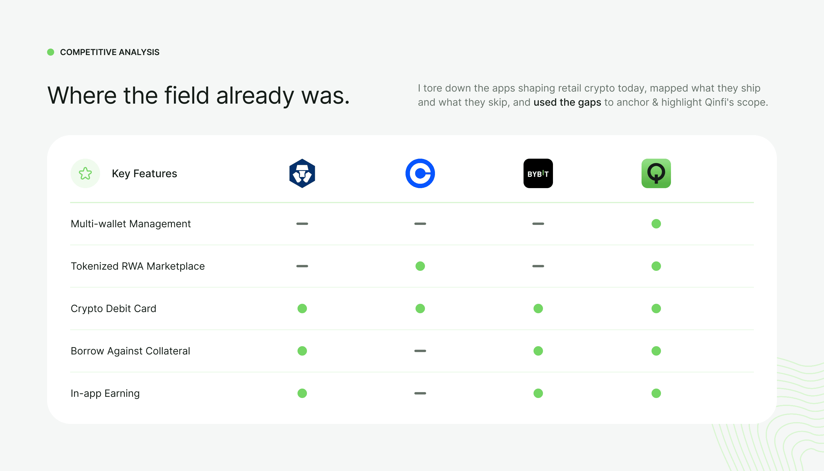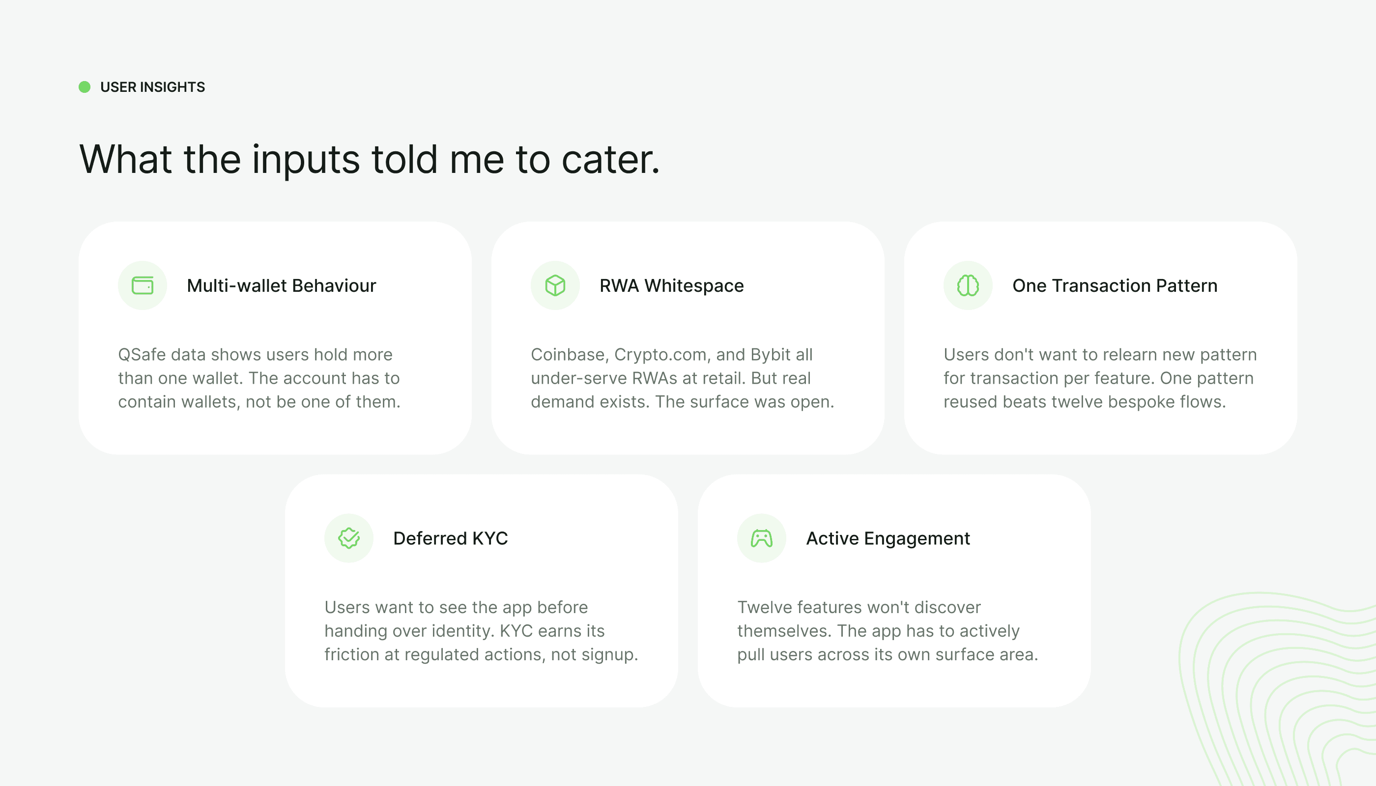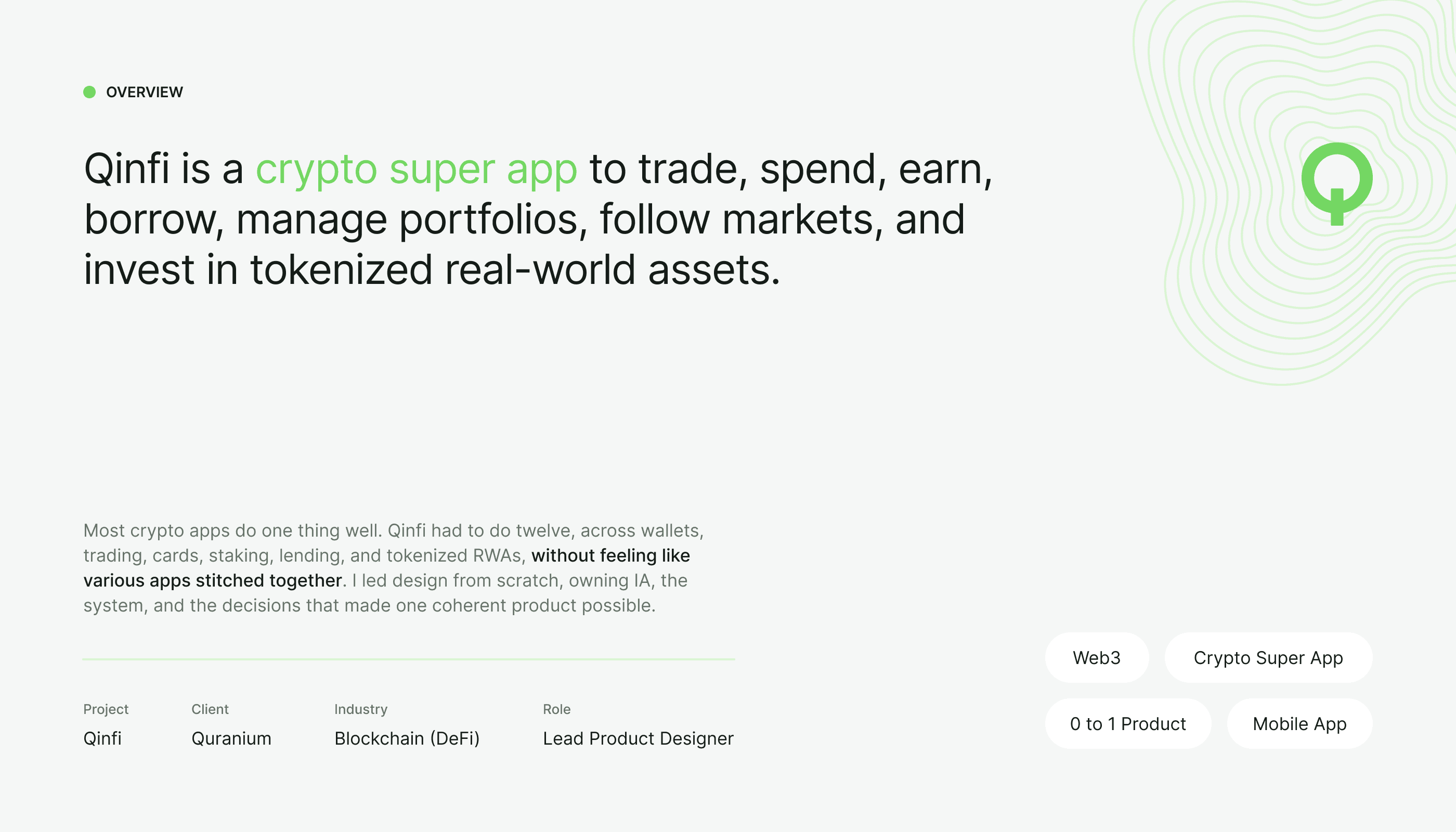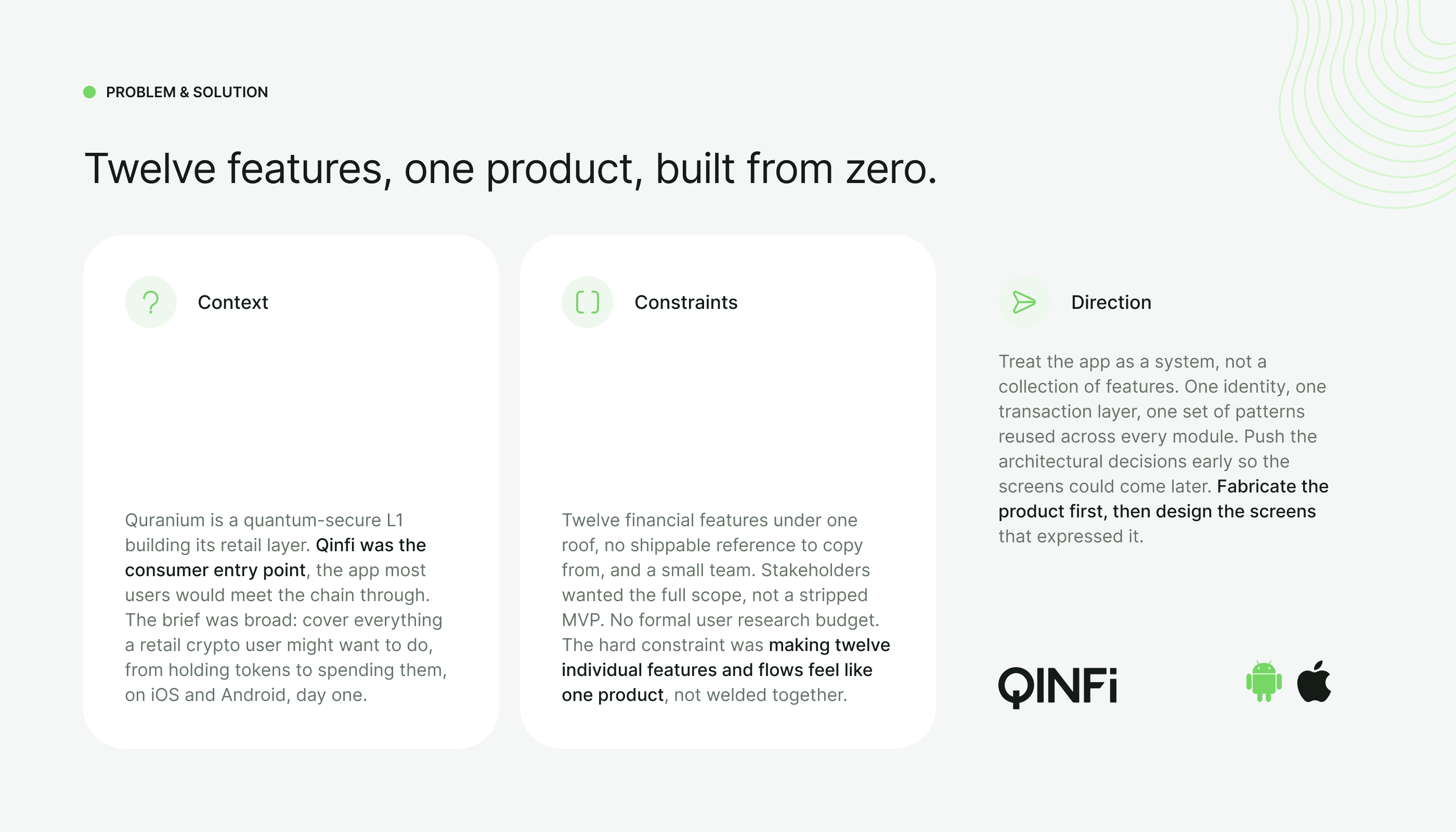 Qinfi is a crypto super app on Quranium's quantum-secure L1. Twelve features, from wallets to cards to tokenised RWAs, built for retail users on iOS and Android. I led design from scratch, owning IA, the system, and the decisions that made these features ship as one coherent product.