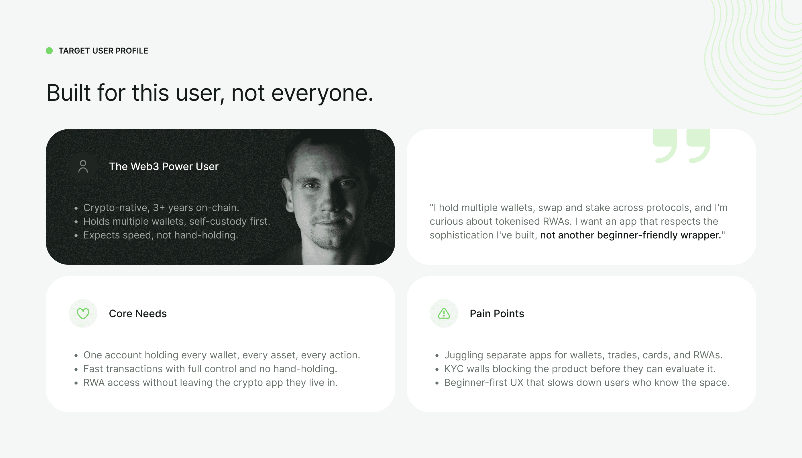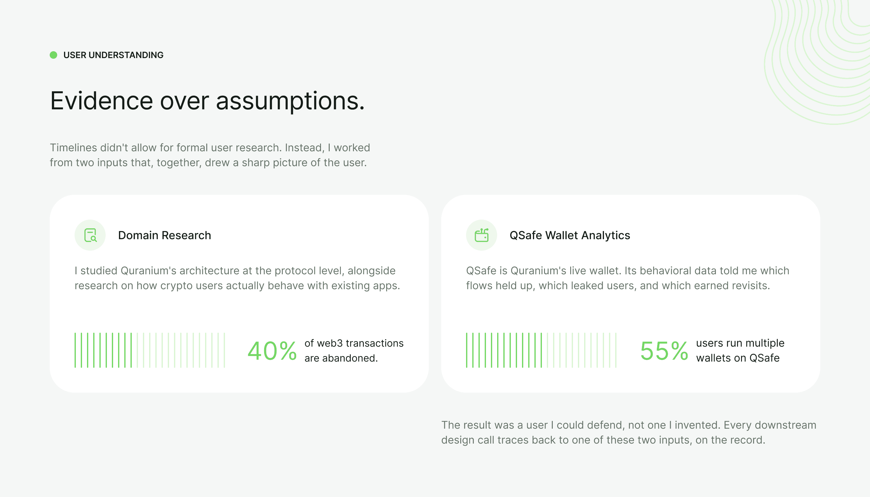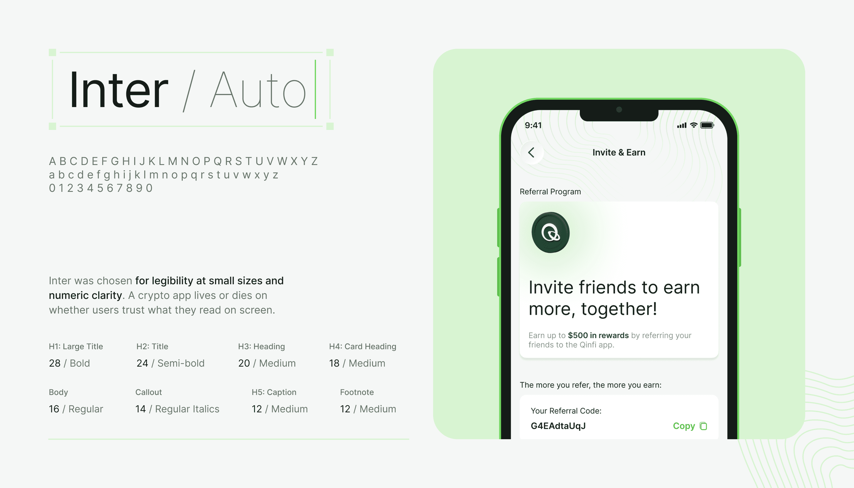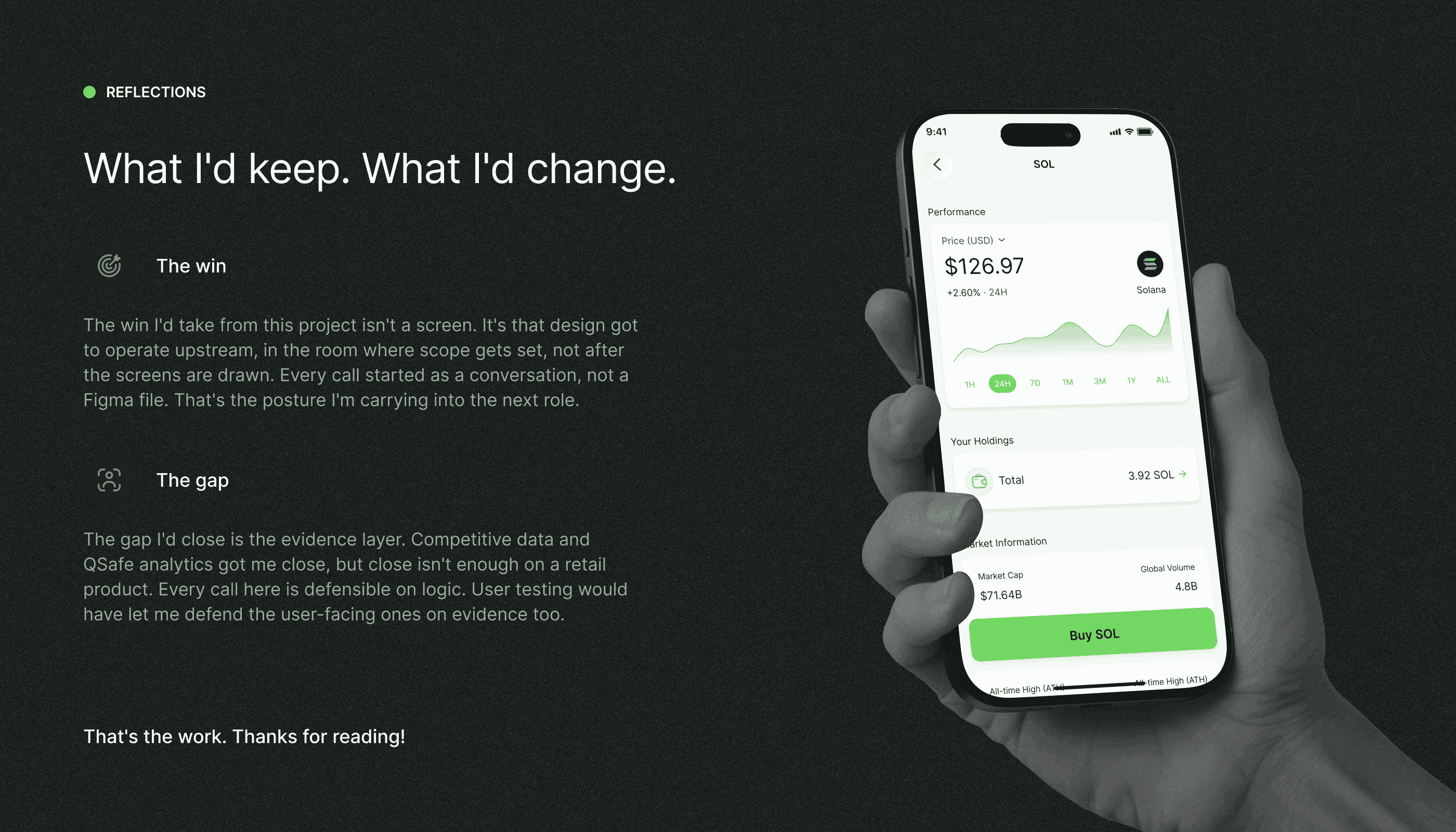 Qinfi is a crypto super app on Quranium's quantum-secure L1. Twelve features, from wallets to cards to tokenised RWAs, built for retail users on iOS and Android. I led design from scratch, owning IA, the system, and the decisions that made these features ship as one coherent product.