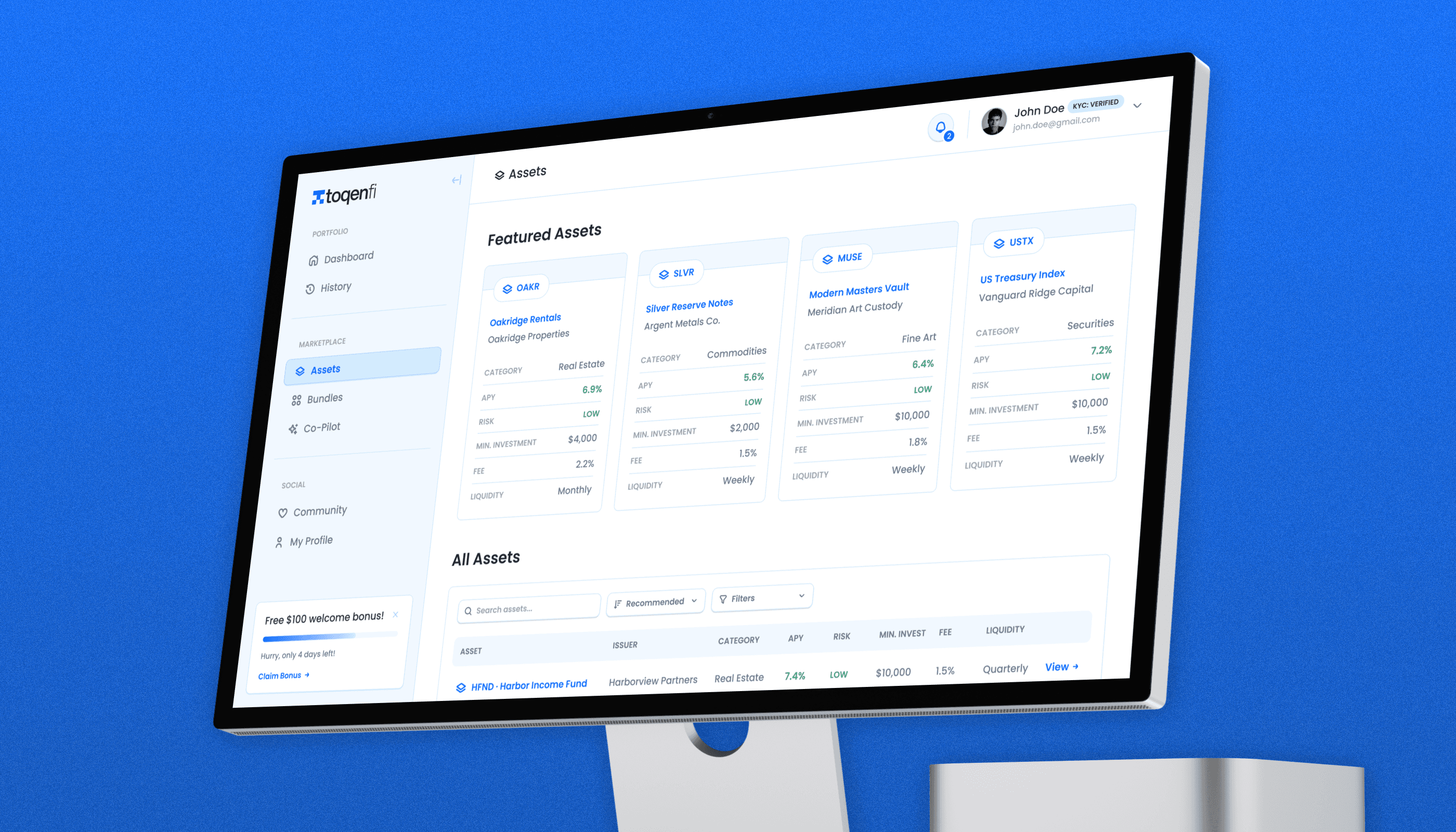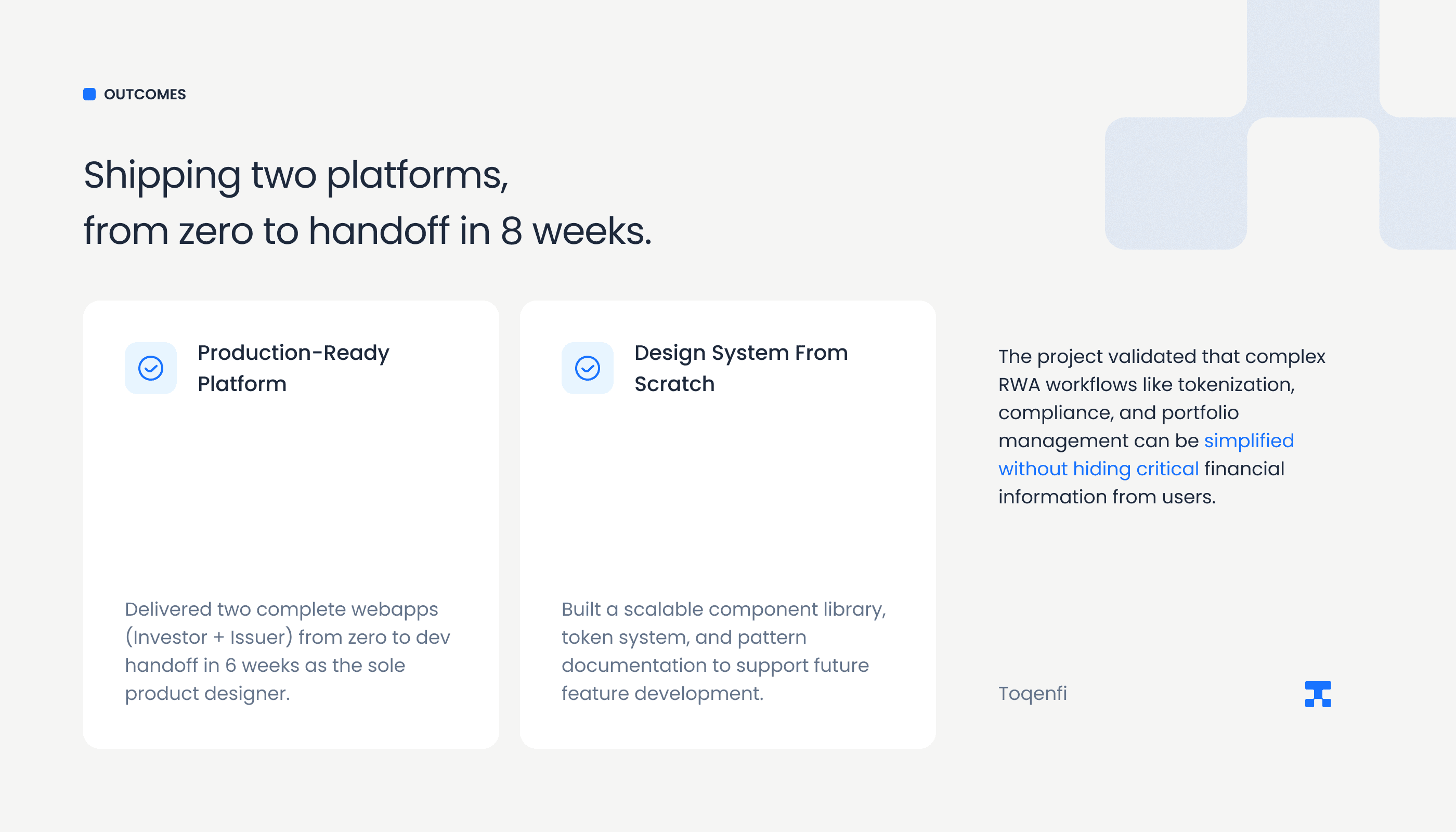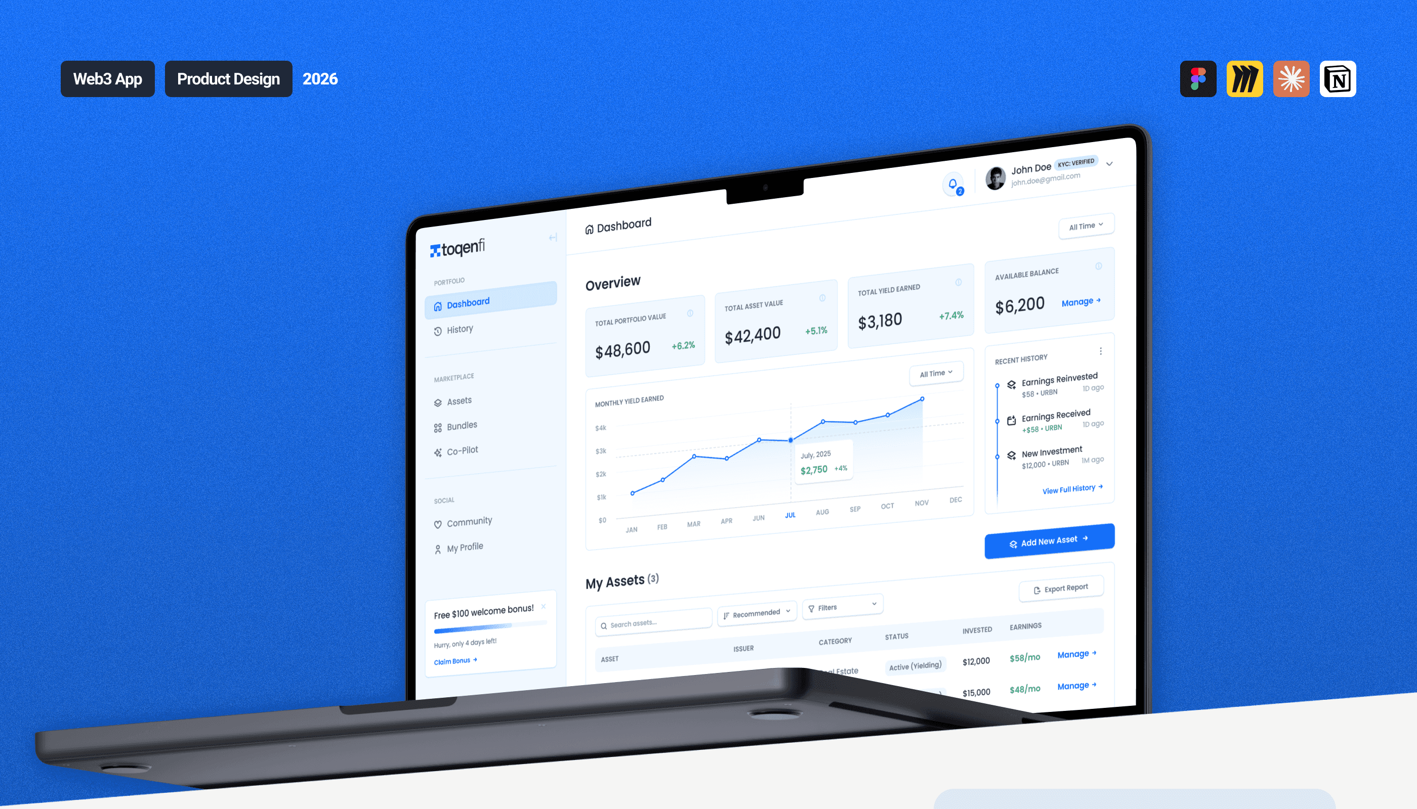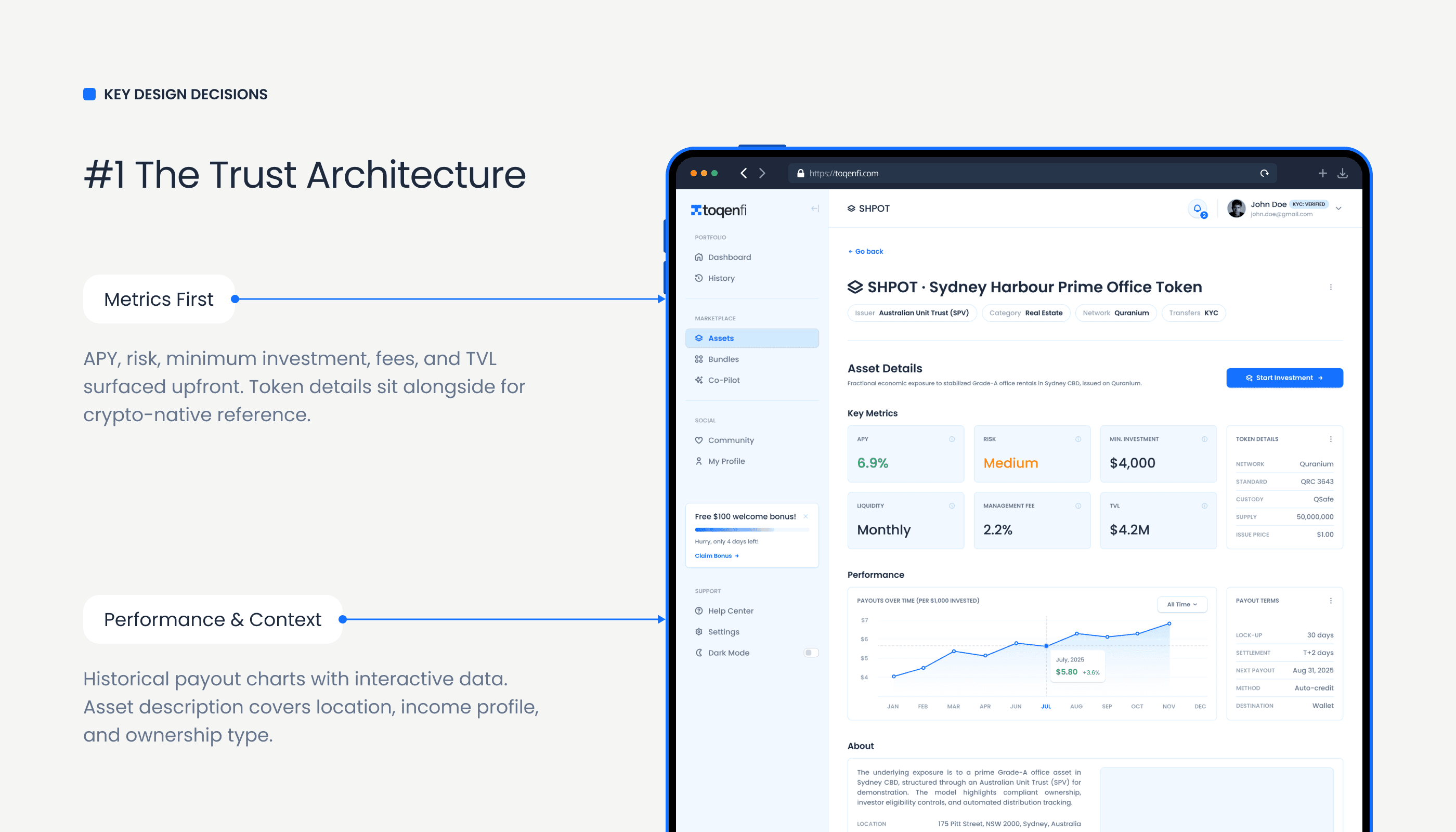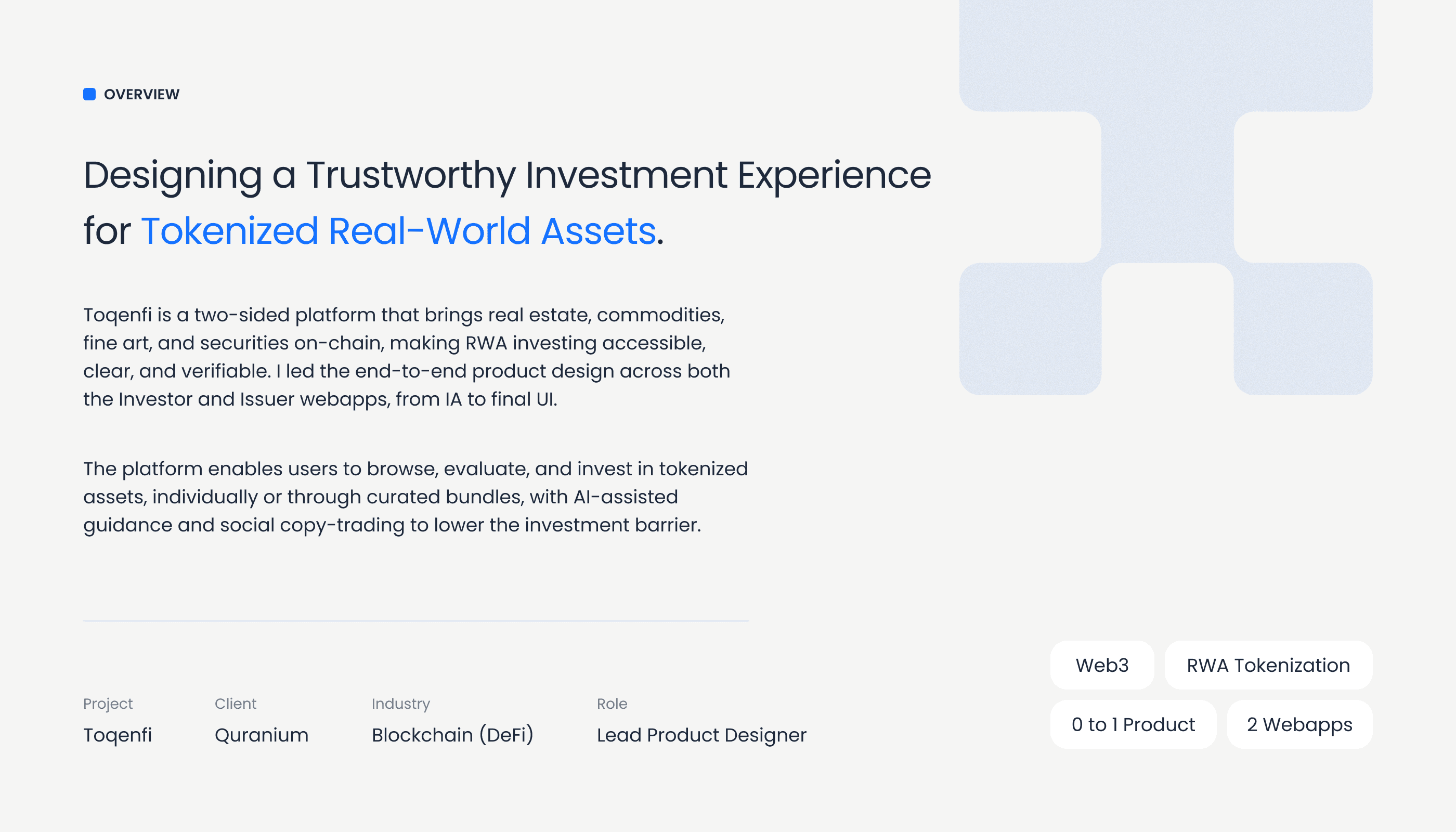Toqenfi is a two-sided RWA investment platform on Quranium's L1, bringing real estate, commodities, fine art, and securities on-chain. I led end-to-end product design across both the Investor and Issuer webapps, from IA to final UI, as the sole designer.